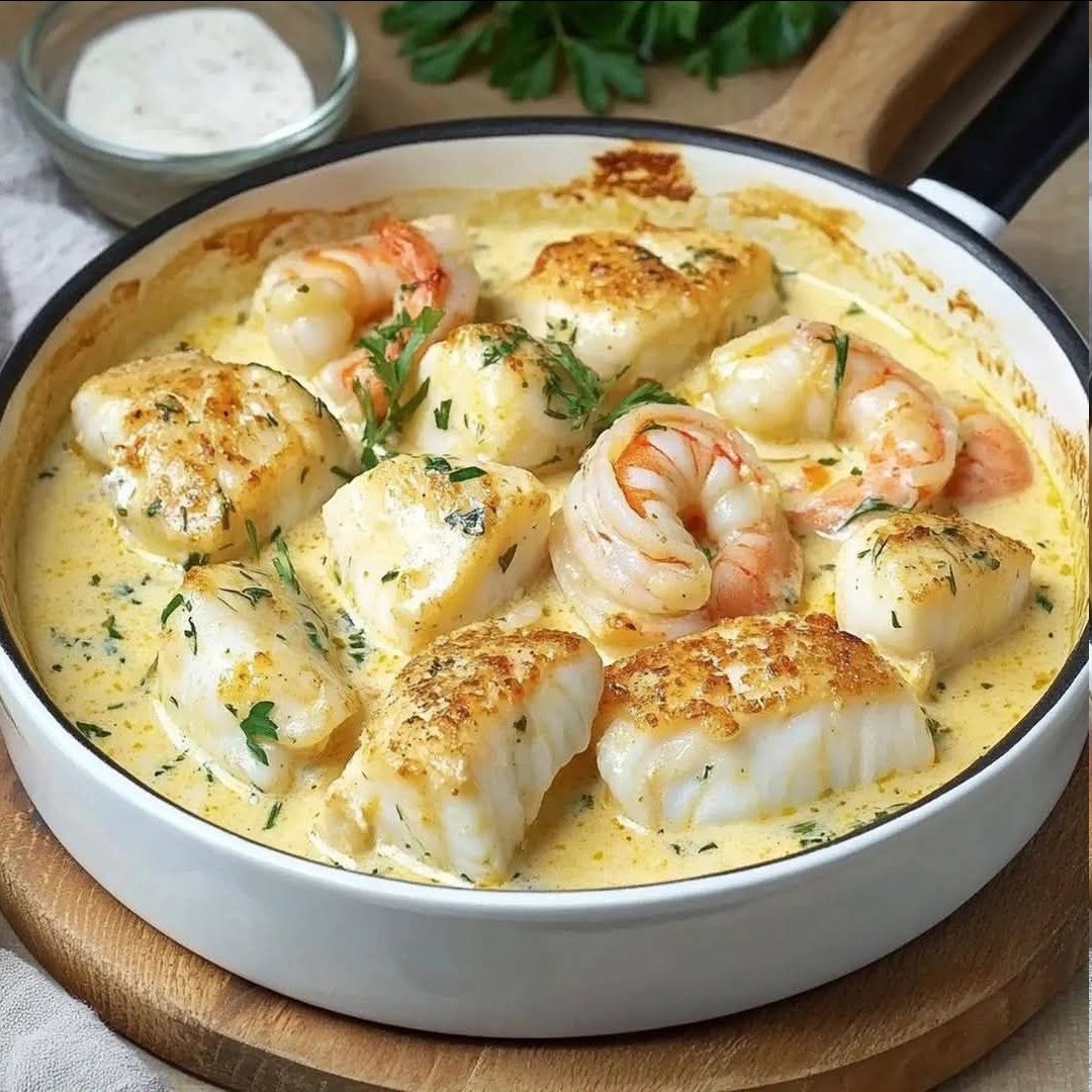 If you’re craving a restaurant-style seafood dish that’s both luxurious and easy to make at home, this Creamy Garlic Butter Fish & Shrimp Skillet is the perfect choice. Tender fish cubes and juicy shrimp are gently cooked in a rich garlic cream sauce, creating a dish that’s full of flavor, elegance, and nutrition — all in just 25 minutes.